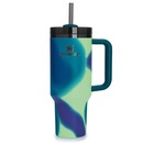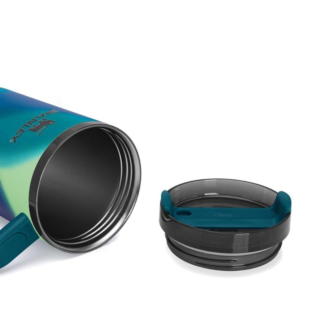- Detalhamento: Copo térmico para bebidas geladas, mantendo até 11 horas a temperatura ou 2 dias com gelo. Isolamento à vácuo de parede dupla, canudo removível, tampa em 3 posições para evitar o respingo de água. Alça emborrachada. O design apresenta um degradê moderno em tons de verde-água e azul, com efeito fluido e visual sofisticado. Formato da base compatível com porta-copos do carro. Não sua por fora. Pode ir na lava-louças;