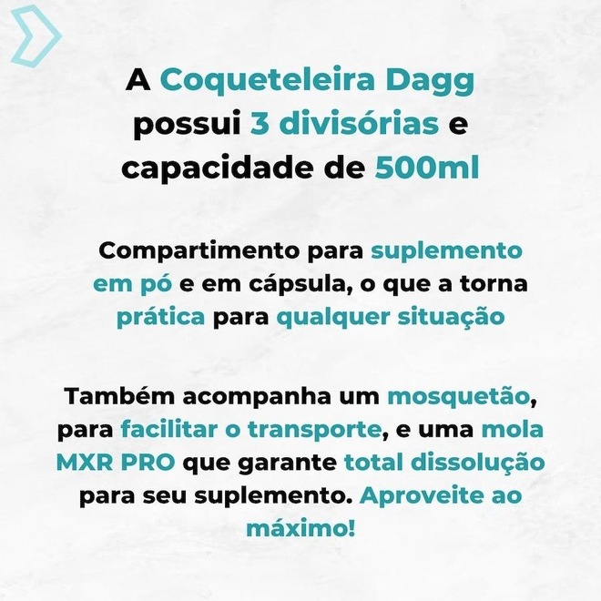 Coqueteleira 3 Doses Dagg 500ML - Descrição: A Coqueteleira Dagg 3 doses possui capacidade para 500ml. Compartimento para 3º dose. Porta comprimido e espaço para seu whey. Possui também uma MOLA MXR PRO, desenvolvida com alta tecnologia para garantir que sua suplementação, seu Whey sejam totalmente dissolvidos e você aproveite ao máximo sua suplementação. Indicação: armazenar e misturar. Diferenciais: BPA free, altamente resistente, possui 3 compartimentos, possui Mola MXR Pro.