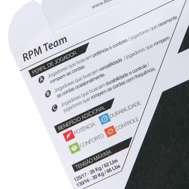 Conheça as características da RPM Team 17L 1.25mm - Perfil: Controle e durabilidade - Material: Co-poliéster - Detalhamento: Set individual com 12m, corda preta - Espessura: 1,25mm / 17L - Origem: Importada.