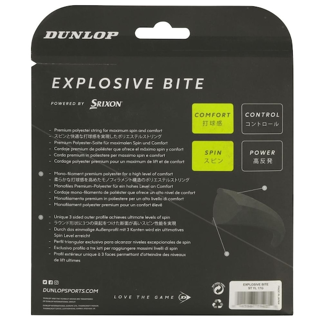 A Dunlop oferece ao mercado brasileiro a mais alta tecnologia em equipamentos esportivos para prática de Tênis, Squash, Golfe e Badminton. Consolidou-se como referência em produtos de alta performance, durabilidade e conforto, estando presente em mais de 50 países, os produtos que são utilizados pelos melhores jogadores do mundo. Dentro desse cenário, a Dunlop apresenta a Corda Dunlop Explosive Bite 17g 1.27mm Set Individual Amarelo, ela propicia spin e conforto máximo.