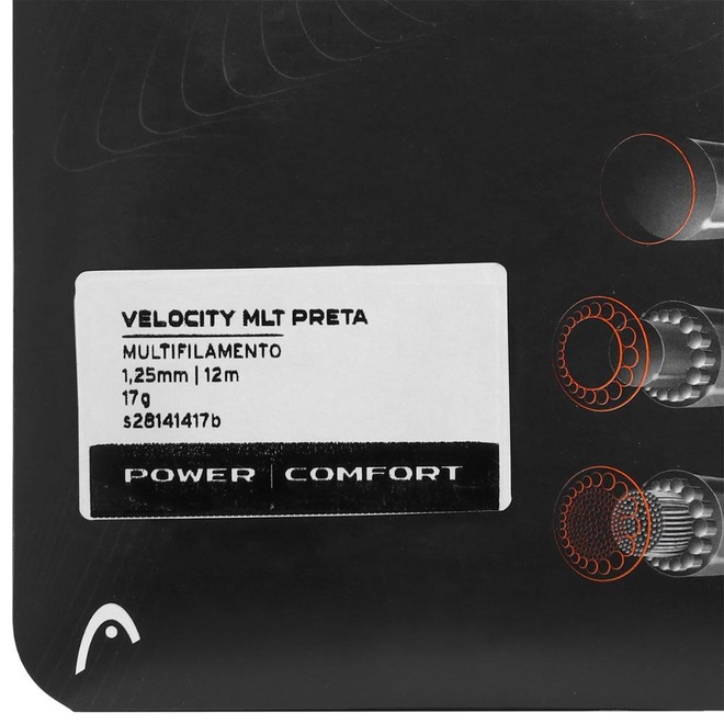 Conheça as características da Corda Head Velocity 17l 1.25mm Preta - Set individual - Perfil: Conforto e Potência - Material: Multifilamento - Detalhamento: Corda na cor Natural, indicada para todos os tipos de jogadores, proporciona conforto e potência, Set com 12m - Espessura: 1.25mm / 17 - Origem: Importado.