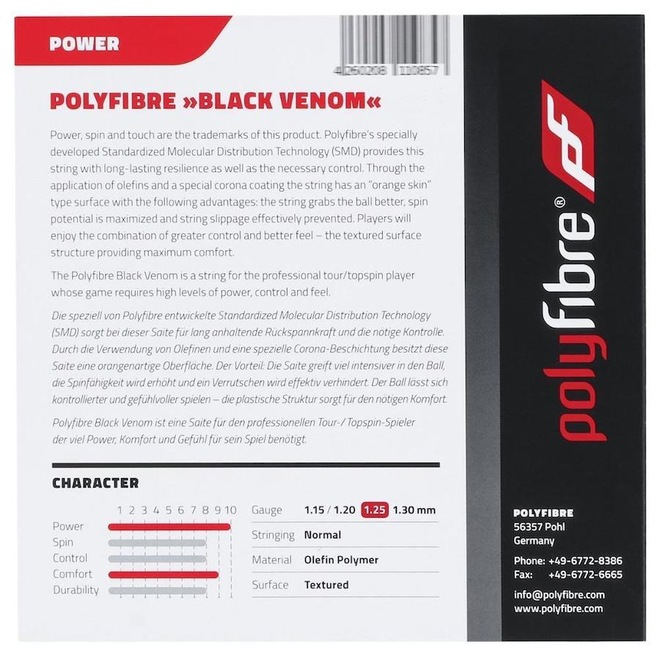 A Polyfibre é uma marca alemã, com reconhecimento internacional por seus produtos de qualidade, focada em desenvolver acessórios para o esporte de tennis, permitindo o máximo de desempenho dos atletas. A prova disso é a Corda Polyfibre Black Venom 17L 1.25mm Preta - Set Individual que proporcionará um excelente conforto e potência em suas jogadas.