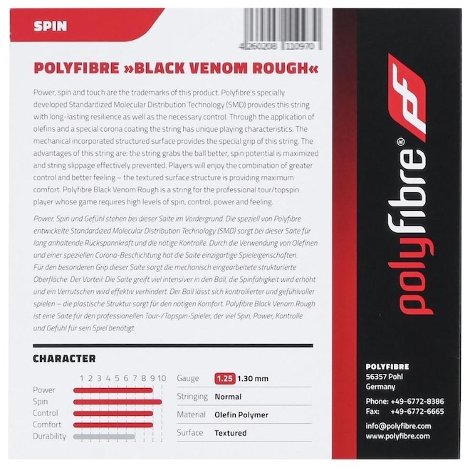 A Polyfibre é uma marca alemã, com reconhecimento internacional por seus produtos de qualidade, focada em desenvolver acessórios para o esporte de tennis, permitindo o máximo de desempenho dos atletas. A prova disso é a Corda Polyfibre Black Venom Rough 17L 1.25mm Preta - Set Individual que proporcionará um excelente spin e controle em suas jogadas.