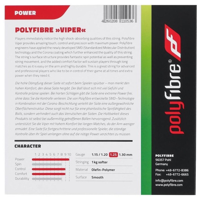 A Polyfibre é uma marca alemã, com reconhecimento internacional por seus produtos de qualidade, focada em desenvolver acessórios para o esporte de tennis, permitindo o máximo de desempenho dos atletas. A prova disso é a Corda Polyfibre Viper 16L 1.30mm Cinza - Rolo com 200 Metros que proporcionará uma excelente conforto e potência em suas jogadas.