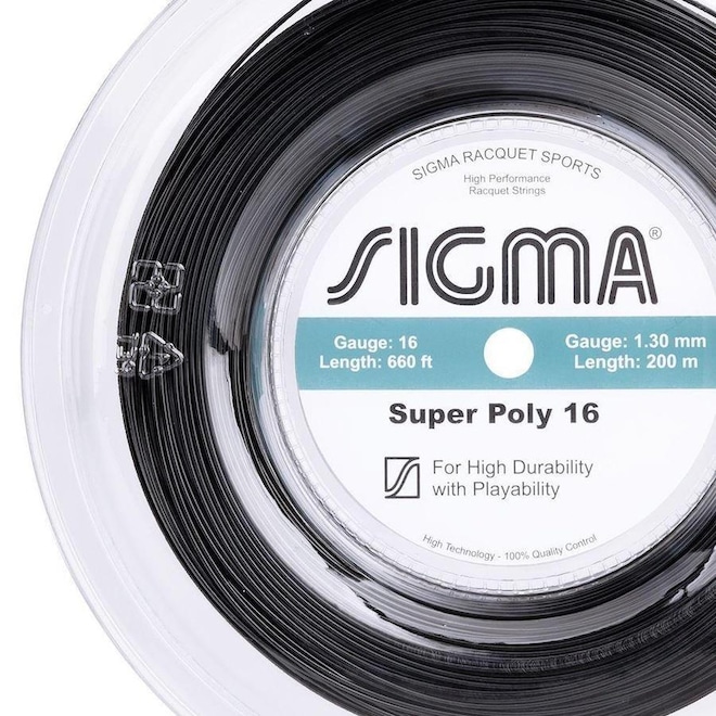 Escolha ideal para qualquer nível de tenista, que busca economia aliado a uma grande durabilidade Conheça as Características da Corda Sigma Super Poly 16L 1.30mm Rolo Com 200 Metros Preta - Perfil: Durabilidade e Economia - Detalhamento: Indicada para todos os tipos de jogadores, desenvolvida em poliéster, corda na cor preta, rolo com 200 metros - Espessura: 16L / 1.30mm - Origem: Importada.