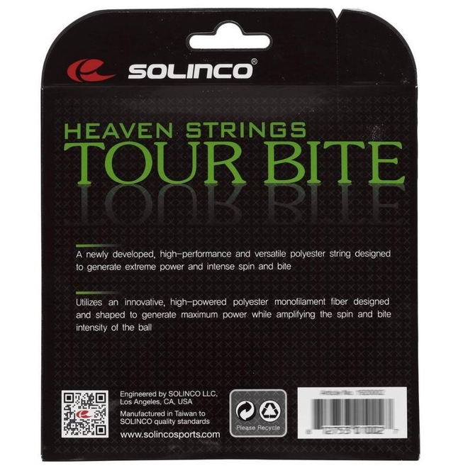 Descrição da Corda Solinco Tour Bite 17L 1.20mm - Set Individual A Solinco é especializada no desenvolvimento e produção de equipamentos de tênis da mais alta qualidade e desempenho do mercado atualmente. Com mais de 30 anos de vasta experiência técnica dentro da equipe, comprometida e focada em continuar liderando o setor em tecnologias inovadoras apresenta Corda Solinco Tour Bite 17L 1.20mm - Set Individual desenvolvida para os tenistas que buscam maior performance do seu jogo. Conheça as características da Corda Solinco Tour Bite 17L 1.20mm - Set Individual - Perfil: Potência e spin; - Material: Poliéster; - Detalhamento: Corda na cor , indicada para todos os tipos de jogadores, proporciona potência e spin, set individual com 12.2 metros; - Espessura: 1.20mm / 17L; - Origem: Importado.