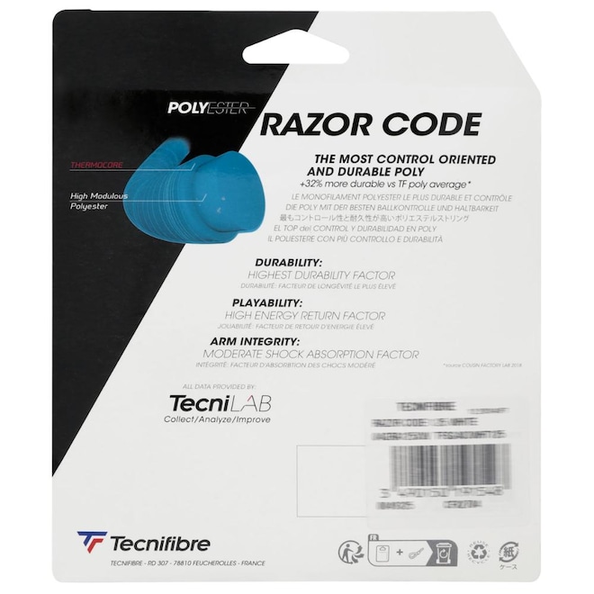 Surgiu na França em 1979, a TecniFibre desenvolve produtos esportivos como acessórios para Tênis, Squash e Padel comercializando seus produtos em vários países ao redor do mundo. Sempre inovadora, seus produtos trazem o que há de melhor em tecnologia, um exemplo disso é a Corda Tecnifibre Razor Code 18 1.20mm - Set Individual - Branca foi desenvolvida em poliéster, é uma corda versátil que proporciona durabilidade e potência em suas jogadas.