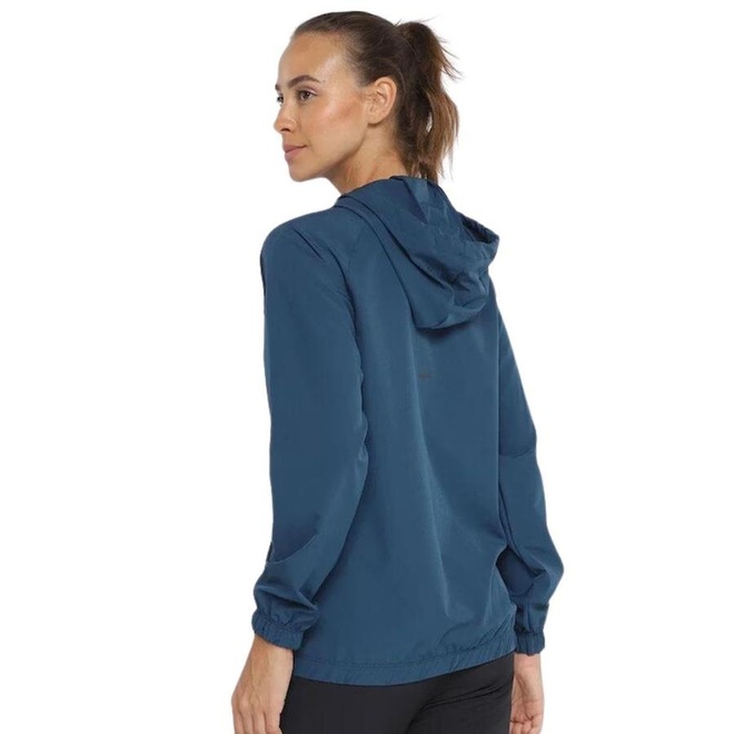 Windbreak feminina confeccionada em tecido plano e leve de poliéster com elastano. Modelagem regular com capuz e manga longa. Possui abertura frontal em zíper com capinha personalizada Fila, bolsos laterais, capuz com elástico interno ajustável e pesponto refletivo, ilhós fusionado, costuras laterais deslocadas para frente, barra e punhos tombados, aplique refletivo Fila Bars centralizado nas costas, logo Fila Letter refletivo aplicado na parte frontal esquerda e barra traseira arredondada com comprimento maior do que a barra frontal.