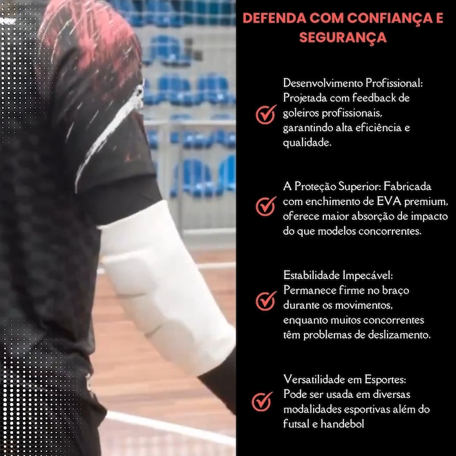 Diferentemente de outras cotoveleiras disponíveis no mercado, nossa versão profissional destaca-se pelo uso de materiais premium e pelo design focado nas necessidades reais dos goleiros.