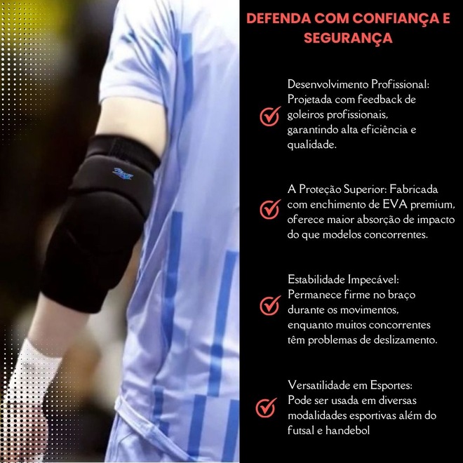 Pensando nisso, apresentamos a Cotoveleira Profissional para Goleiro de Futsal, desenvolvida com materiais de alta qualidade e design ergonômico para proporcionar o máximo de segurança e desempenho.Proteção Avançada: Enchimento em EVA de alta densidade para máxima absorção de impacto, reduzindo o risco de lesões.