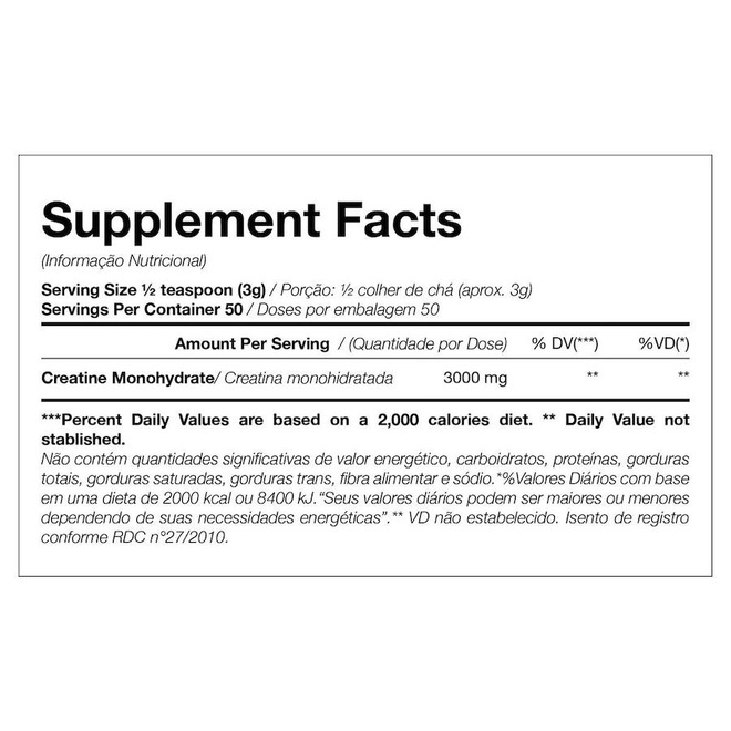 A Creatina da Black Skull é um produto composto 100% por creatina monoidratada que irá fornecer mais energia para melhorar o desempenho físico durante exercícios repetidos de curta duração e alta intensidade, contribuindo para a hipertrofia muscular. Creatina Black Skull é um suplemento alimentar à base de creatina monohidratada que tem como objetivo principal fornecer Explosão ao atleta durante os treinos, possui a função de aumentar a energia instantaneamente no organismo durante exercícios físicos de longa ou curta duração, principalmente em exercícios de explosão. Benefícios. Aumento de força; Explosão; Mais energia; Auxilia no ganho de massa muscular. Ingredientes: Creatina monohidratada. Não Contém Glúten. Sugestão de Uso: Adicionar 1/2 colher de chá (aprox. 3g) de Creatine em 150ml de água e consumir uma vez ao dia conforme recomendação de um profissional da saúde. Importante que seu consumo esteja aliado a uma alimentação balanceada e a prática de exercício físico. Recomendação para adultos acima de 19 anos de idade. Consumir imediatamente após o preparo. Recomendamos o armazenamento do produto em local seco, ao abrigo de luz e seu consumo em até 30 dias após a retirada do lacre interno.ref: M0ZBZ1