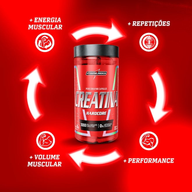 Creatina Hardcore Integralmédica contribui para o desempenho físico de atletas que praticam exercícios físicos repetitivos de alta intensidade e curta duração.