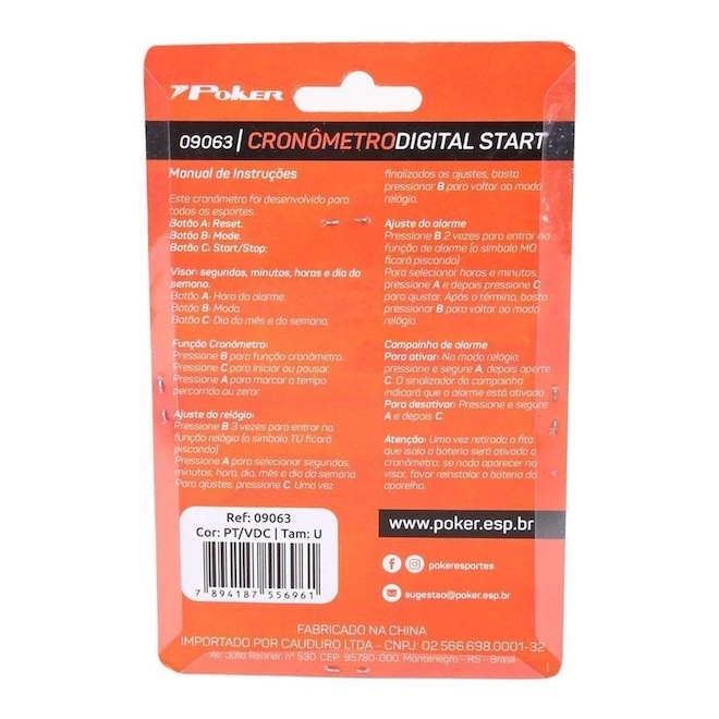 O produto possui as seguintes funções: relógio, calendário, cronômetro e alarme.