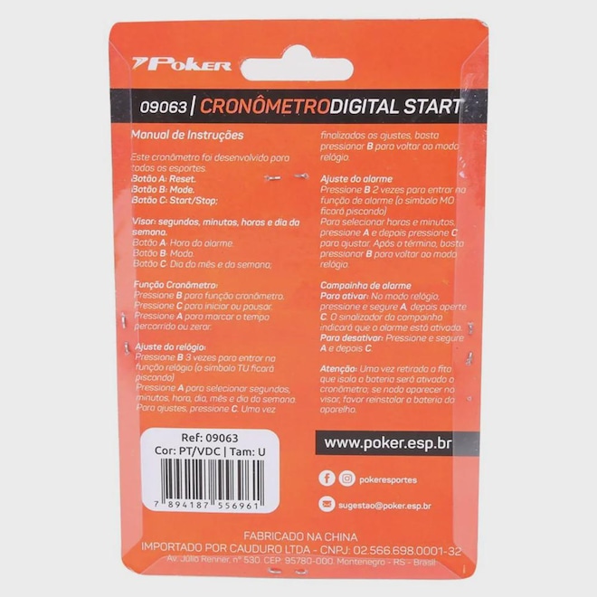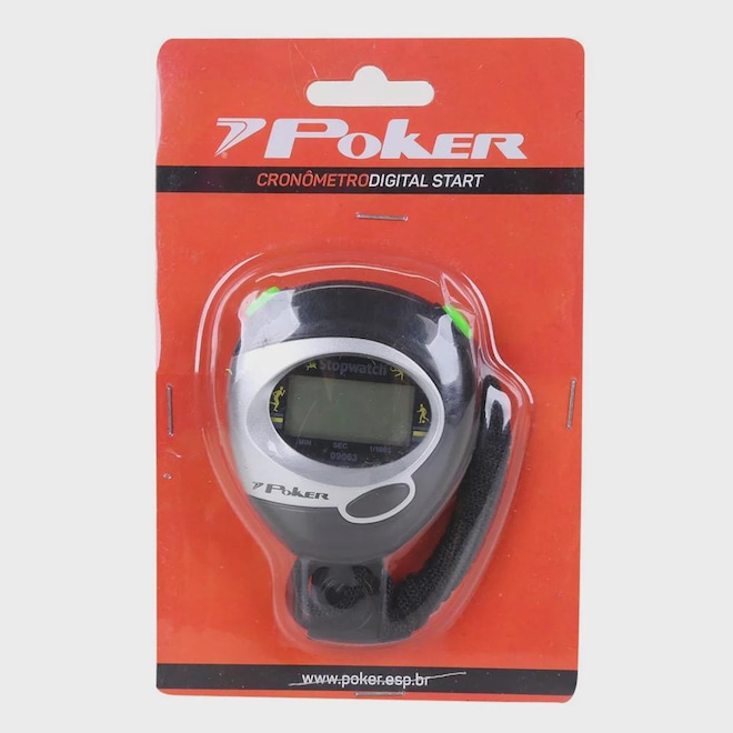 Com diversas funções para te auxiliar a registrar seus melhores tempos durante as práticas esportivas a Poker oferece o Cronômetro Poker Digital Start. Além de marcar e criar comparativos dos seus tempos, mostrando até os milésimos durante os primeiros 30 minutos, traz a função do calendário com data e hora ajustáveis, e alarmes programáveis. Desenvolvido para ser utilizado em todos os tipos de esportes. Não perca tempo e garanta já o seu!