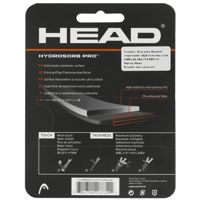 Atualmente, a Head é uma marca líder no mercado mundial nos segmentos de esporte de inverno, tênis e mergulho. Seus produtos são desenvolvidos com alta tecnologia, performance e são utilizados por alguns dos melhores atletas do mundo. Pensando nisso, a Head lança o Cushion Grip Head Hydrosorb Pro Cinza, composto por um sistema de canal duplo, proporciona melhor conforto, sua superfície de elastômero de alta aderência concede fluxo de ar e as perfurações para melhor absorção do suor. Já sua adesão cria um sistema de resposta rápida da raquete, para melhor controle e desempenho das suas jogadas.