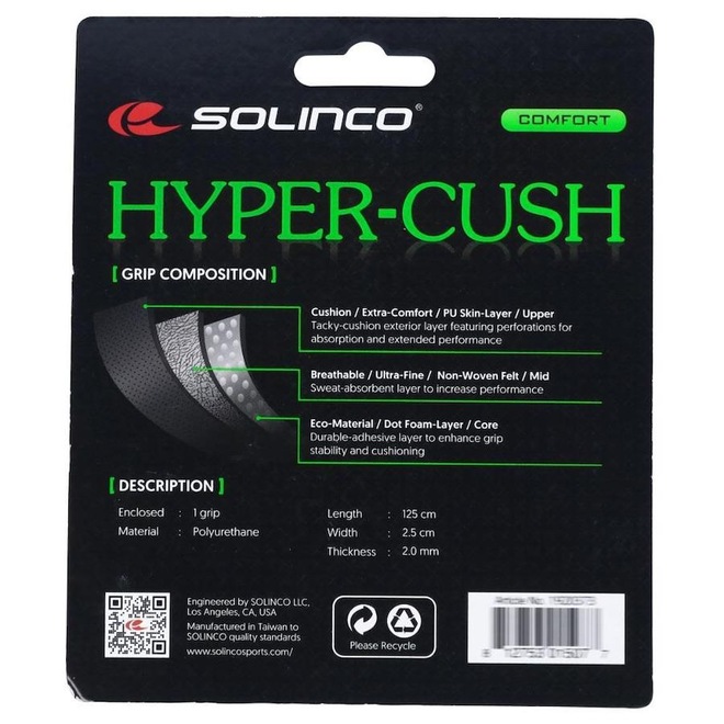 Descrição do Cushion Grip Solinco Hyper Cush A Solinco é especializada no desenvolvimento e produção de equipamentos de tênis da mais alta qualidade e desempenho do mercado atualmente. Com mais de 30 anos de vasta experiência técnica dentro da equipe, comprometida e focada em continuar liderando o setor em tecnologias inovadoras apresenta Cushion Grip Solinco Hyper Cush desenvolvida para os tenistas que buscam maior performance do seu jogo. Conheça as características do Cushion Grip Solinco Hyper Cush - Perfil: Tênis; - Material: Emborrachado; - Detalhamento: Pacote com 01 unidade; - Medidas: 125cm x 2.5cm x 2.0mm; - Origem: Importado.