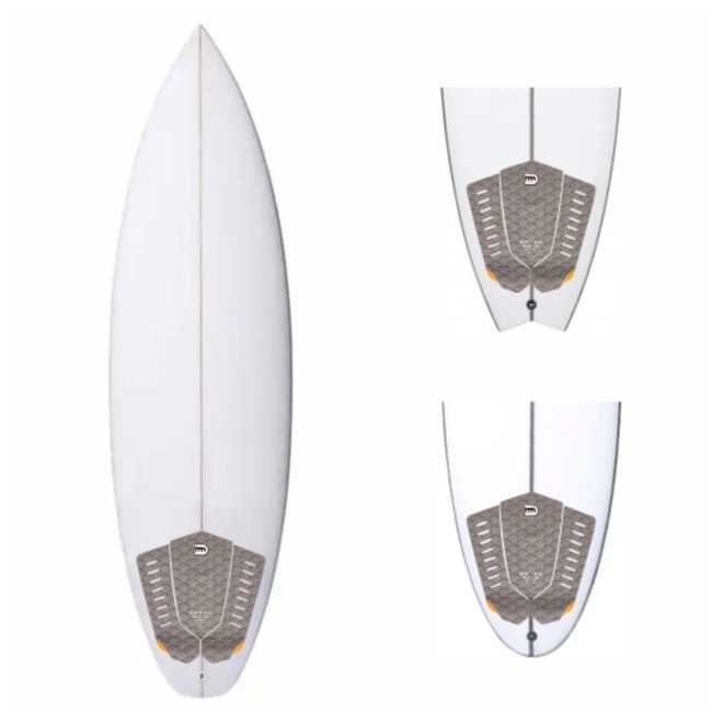 Nosso deck conta ainda com barra central, uma espécie de lombada localizada no centro do produto, para um encaixe anatômico do pé e kick tail acentuado, uma barreira localizada na parte traseira, utilizada para execução de manobras e como referencia do "final da prancha". Este modelo em específico, é formado por 3 partes, que podem ser coladas juntas, ou separadas, aumentando assim a area total do deck.