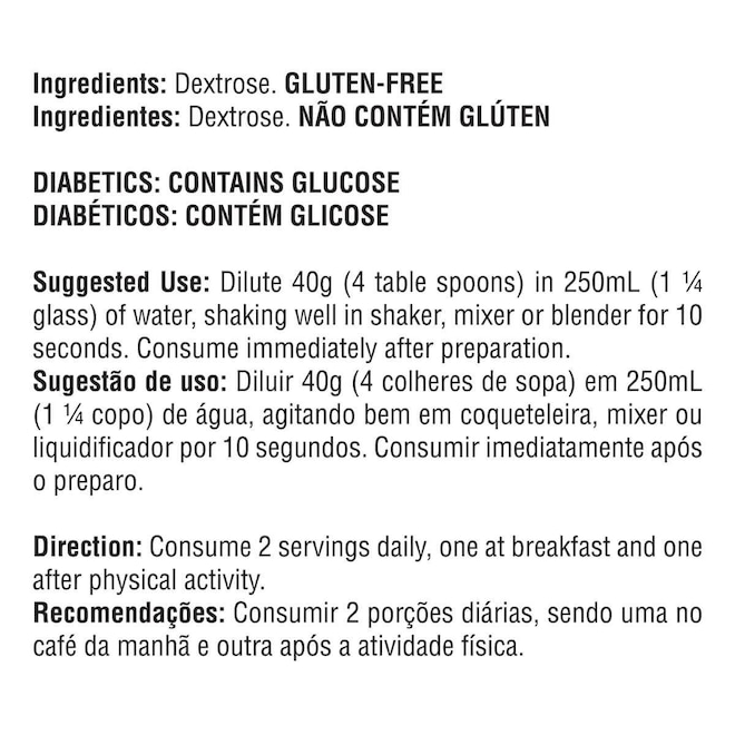 Consumir 2 porções diárias, sendo uma no café da anhã e outra após o preparo.IngredientesDextrose.