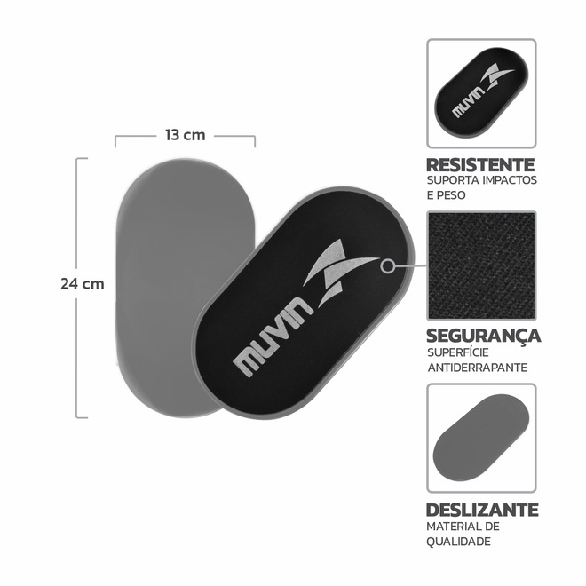 Os Discos de Deslizamento da Muvin foram desenvolvidos com foco em treinamentos funcionais e pilates, com o objetivo de auxiliar em exercícios de agachamento, deslizamento, flexões e pranchas. Também conhecidos como core sliders, são fabricados em plástico poliestireno de alta resistência, uma resina termoplástica resistente a impactos e a grandes volumes de peso.