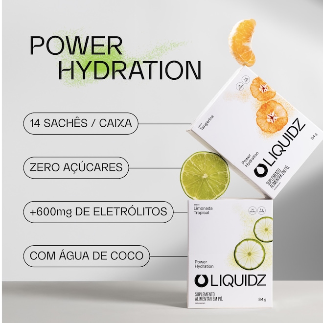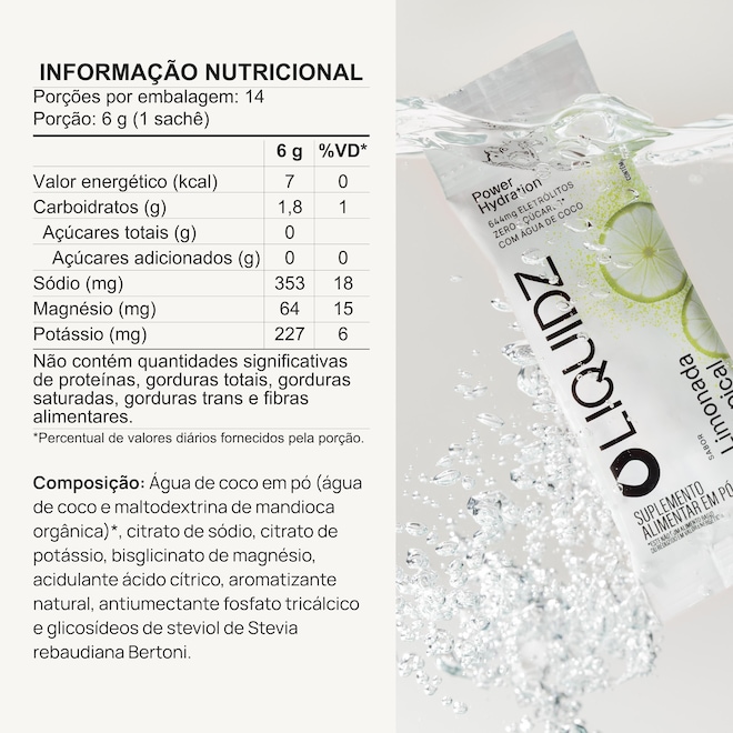 Experimente o que há de mais inovador em hidratação no Brasil. 644mg de Eletrólitos Apenas 7 calorias por stick ZERO açúcares Aromas 100% naturais Com água de coco Sem corantes artificiais LIQUIDZ é uma solução de hidratação que combina os principais eletrólitos essenciais como sódio, potássio e magnésio. Esses minerais são fundamentais para manter a hidratação adequada, melhorar a função muscular e nervosa, e equilibrar o pH do corpo. LIQUIDZ é formulado para ser consumido diariamente, especialmente ao acordar, durante e após atividades físicas, para garantir uma hidratação eficiente e rápida. BENEFÍCIOS • Hidratação Rápida e Eficaz Fornece uma combinação balanceada de eletrólitos que facilita a absorção de água a nível celular, promovendo uma hidratação mais rápida e eficaz que apenas água. • Aumento de Energia e Disposição Ajuda a combater a fadiga e a falta de energia ao repor eletrólitos perdidos, especialmente após atividades físicas intensas ou períodos de desidratação. • Melhora na Recuperação Muscular A presença de sódio, potássio e magnésio ajuda a prevenir e diminuir cãibras musculares, melhorando o desempenho muscular e a recuperação pós exercício. • Apoio à Função Cognitiva Mantém o equilíbrio dos eletrólitos, essencial para funções cognitivas como foco e concentração, prevenindo sintomas de desidratação que afetam a mente. • Alívio de Dores de Cabeça Contribui para a manutenção do volume sanguíneo e a prevenção da contração dos vasos sanguíneos no cérebro, reduzindo a incidência de dores de cabeça causadas pela desidratação. COMO PREPARAR Basta abrir um stick (sachê) de LIQUIDZ rasgando a embalagem no local indicado e despejar o pó em 325 a 500ml de água (recomendamos água gelada). Se você prefere um sabor mais concentrado e doce, utilize uma quantidade menor de água. Este anúncio contém 1 caixa com 14 sachês.