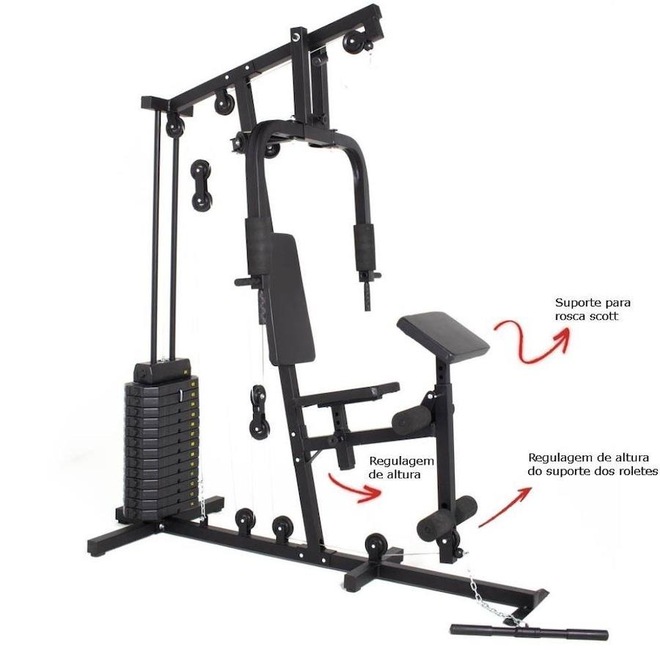 Com um simples ajuste da máquina, você pode isolar músculos específicos com um supino ou movimento de borboleta. DESENVOLVEDOR DE PERNAS DE 4 ROLOS: O desenvolvedor de pernas de 4 rolos permite exercícios de extensão de perna para isolar os músculos da perna da frente, bem como flexões de perna para atingir a parte de trás das pernas, para que você possa obter um treino completo de perna com qualidade de academia em casa. Especificações Técnicas: Cor: Carga da Torre: 66 Kg Material: Metal e PVC Peso suportado: 120kg Peso do produto: 148 kg Itens inclusos: 1 Estação Cor: com estofamento Dimensões aproximadas: Altura 2,18m x Largura 1,11 m x Comprimento 1,83m Garantia: 3 Meses contra defeito de fabricação Importante: Não é permitido adicionar peso extra Montagem do equipamento: Montagem não inclusa.
