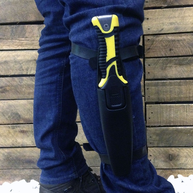 Para a sua comodidade, a faca de mergulho Balleno vem com estojo rígido de ação rápida e cinta de borracha para fixação, facilitando assim o seu uso.