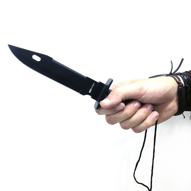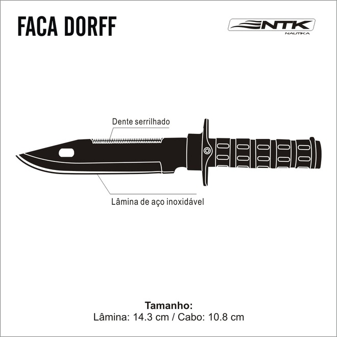 Do lado oposto à lâmina, a faca Dorff possui dente serrilhado para diversificar seu uso. Seu cabo é texturizado de polímero anti-deslizante, garantindo um melhor manuseio, e conta também com um espaço para passar cordão. Inclui estojo de transporte com passador de cinto.