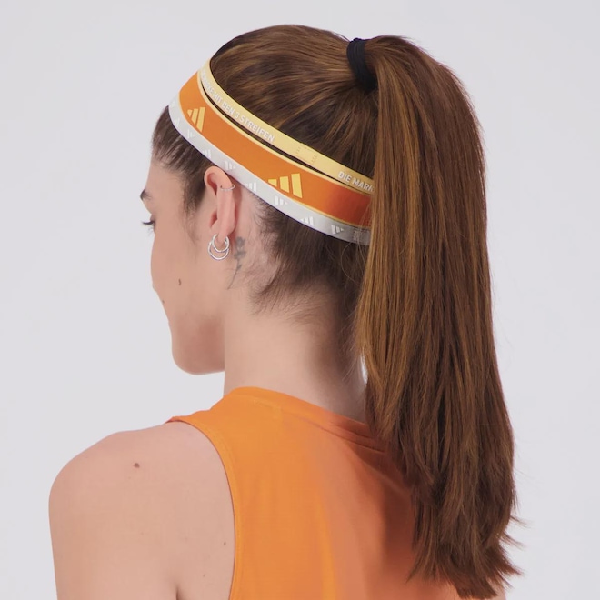 Dimensões aproximadas (A X L): 01 - 2,3 cm x 24 cm/ 2 - 1 cm x 24 cm Composição: 72% Poliamida, 22% Poliéster, e 06% Elastano Contém: 02 Faixas na cor laranja e 01 na cor cinza Origem: Importada Gênero: Unissex Tamanho único *Esta peça possui alta elasticidade e serve em vários formatos de cabeça.