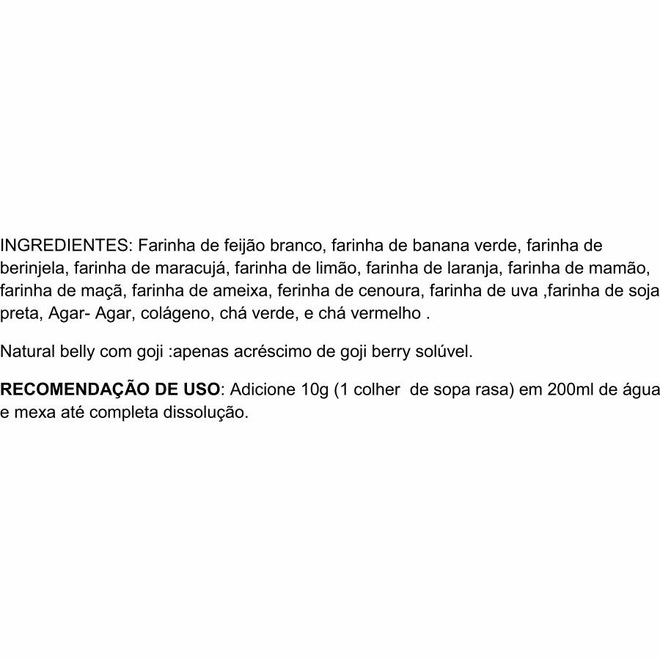 Farinha de feijão branco, farinha de banana verde, farinha de berinjela, farinha de maracujá, farinha de limão, farinha de laranja, farinha de mamão, farinha de maçã, farinha de ameixa, farinha de cenoura, farinha de uva, farinha de soja preta, psyllium, agar agar, colágeno e chá verde..