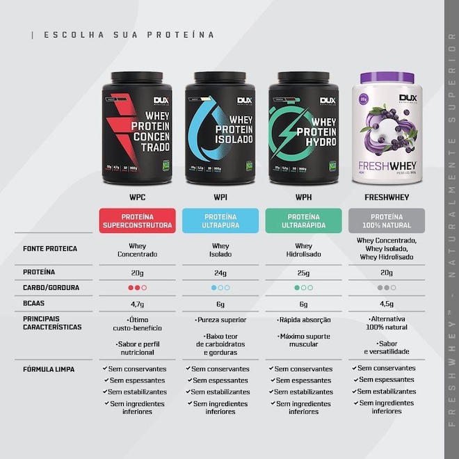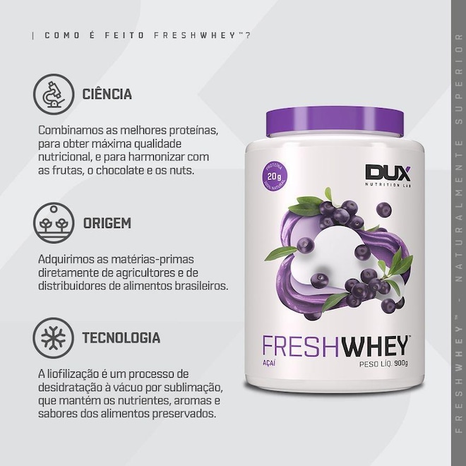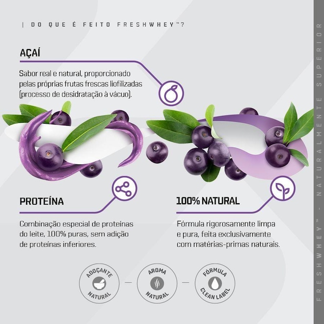 O que é FreshWhey?? Apesar das variadas opções de suplementos de proteínas no mercado, encontrar qualidade e sabor, unidos em uma fórmula limpa e pura, é um desafio. FreshWhey? é uma nova categoria de proteínas, totalmente naturais, feitas com frutas e nuts de verdade, que proporcionam sabores reais, com uma fórmula rigomente limpa e pura. Proteínas Fórmula especial com 3 tipos de proteínas do soro do leite: concentrada, isolada e hidrolisada. Essa combinação traz o melhor de cada uma delas: sabor, pureza e qualidade. São 20g de proteína por dose, com alta qualidade e sabor delicioso. Frutas e Nuts Para nós, o melhor sabor vem da natureza. Feito com alimentos naturais, nosso objetivo foi trazer o frescor das frutas e o gosto de verdade do chocolate e das pastas de amendoim e avelã. Isso só é possível através do processo de liofilização, mantendo o sabor original, seu valor nutricional e seus benefícios funcionais. 100% Natural Fórmula rigomente limpa e pura, feita exclusivamente com matérias-primas naturais, sem ingredientes inferiores ou artificiais. Seguimos um padrão de excelência na escolha de cada proteína, cada fruta, cada ingrediente ? é assim que garantimos um produto para consumidores tão exigentes como nós. Por trás do rótulo: Proteína As proteínas são os suplementos mais famosos e mais populares. É fácil entender por quê. A proteína é o alicerce nutricional do corpo, sendo encontrada nos músculos, ossos, pele, cabelos, e basicamente em todas as outras partes ou tecidos do corpo. Ela é feita de mais de 20 moléculas construtoras chamados aminoácidos, que participam de muitas reações químicas. Pelo menos 10.000 proteínas diferentes nos fazem como somos, e nos mantém assim.