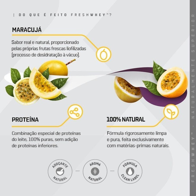 O que é FreshWhey?? Apesar das variadas opções de suplementos de proteínas no mercado, encontrar qualidade e sabor, unidos em uma fórmula limpa e pura, é um desafio. FreshWhey? é uma nova categoria de proteínas, totalmente naturais, feitas com frutas e nuts de verdade, que proporcionam sabores reais, com uma fórmula rigomente limpa e pura. Proteínas Fórmula especial com 3 tipos de proteínas do soro do leite: concentrada, isolada e hidrolisada. Essa combinação traz o melhor de cada uma delas: sabor, pureza e qualidade. São 20g de proteína por dose, com alta qualidade e sabor delicioso. Frutas e Nuts Para nós, o melhor sabor vem da natureza. Feito com alimentos naturais, nosso objetivo foi trazer o frescor das frutas e o gosto de verdade do chocolate e das pastas de amendoim e avelã. Isso só é possível através do processo de liofilização, mantendo o sabor original, seu valor nutricional e seus benefícios funcionais. 100% Natural Fórmula rigomente limpa e pura, feita exclusivamente com matérias-primas naturais, sem ingredientes inferiores ou artificiais. Seguimos um padrão de excelência na escolha de cada proteína, cada fruta, cada ingrediente ? é assim que garantimos um produto para consumidores tão exigentes como nós. Por trás do rótulo: Proteína As proteínas são os suplementos mais famosos e mais populares. É fácil entender por quê. A proteína é o alicerce nutricional do corpo, sendo encontrada nos músculos, ossos, pele, cabelos, e basicamente em todas as outras partes ou tecidos do corpo. Ela é feita de mais de 20 moléculas construtoras chamados aminoácidos, que participam de muitas reações químicas. Pelo menos 10.000 proteínas diferentes nos fazem como somos, e nos mantém assim.