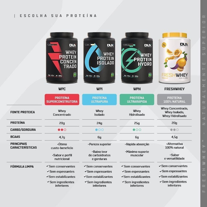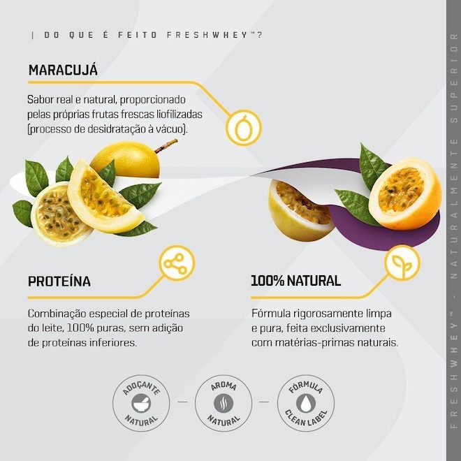 O que é FreshWhey?? Apesar das variadas opções de suplementos de proteínas no mercado, encontrar qualidade e sabor, unidos em uma fórmula limpa e pura, é um desafio. FreshWhey? é uma nova categoria de proteínas, totalmente naturais, feitas com frutas e nuts de verdade, que proporcionam sabores reais, com uma fórmula rigomente limpa e pura. Proteínas Fórmula especial com 3 tipos de proteínas do soro do leite: concentrada, isolada e hidrolisada. Essa combinação traz o melhor de cada uma delas: sabor, pureza e qualidade. São 20g de proteína por dose, com alta qualidade e sabor delicioso. Frutas e Nuts Para nós, o melhor sabor vem da natureza. Feito com alimentos naturais, nosso objetivo foi trazer o frescor das frutas e o gosto de verdade do chocolate e das pastas de amendoim e avelã. Isso só é possível através do processo de liofilização, mantendo o sabor original, seu valor nutricional e seus benefícios funcionais. 100% Natural Fórmula rigomente limpa e pura, feita exclusivamente com matérias-primas naturais, sem ingredientes inferiores ou artificiais. Seguimos um padrão de excelência na escolha de cada proteína, cada fruta, cada ingrediente ? é assim que garantimos um produto para consumidores tão exigentes como nós. Por trás do rótulo: Proteína As proteínas são os suplementos mais famosos e mais populares. É fácil entender por quê. A proteína é o alicerce nutricional do corpo, sendo encontrada nos músculos, ossos, pele, cabelos, e basicamente em todas as outras partes ou tecidos do corpo. Ela é feita de mais de 20 moléculas construtoras chamados aminoácidos, que participam de muitas reações químicas. Pelo menos 10.000 proteínas diferentes nos fazem como somos, e nos mantém assim.