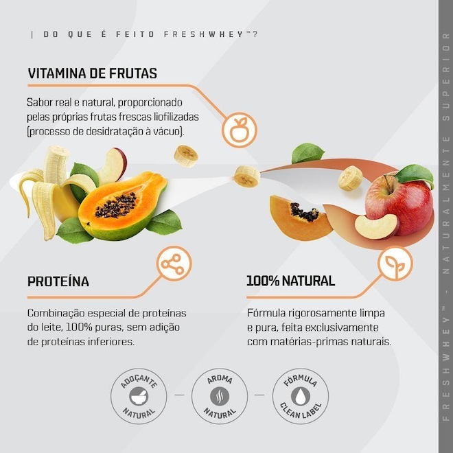 O que é FreshWhey?? Apesar das variadas opções de suplementos de proteínas no mercado, encontrar qualidade e sabor, unidos em uma fórmula limpa e pura, é um desafio. FreshWhey? é uma nova categoria de proteínas, totalmente naturais, feitas com frutas e nuts de verdade, que proporcionam sabores reais, com uma fórmula rigorosamente limpa e pura. Proteínas Fórmula especial com 3 tipos de proteínas do soro do leite: concentrada, isolada e hidrolisada. Essa combinação traz o melhor de cada uma delas: sabor, pureza e qualidade. São 20g de proteína por dose, com alta qualidade e sabor delicioso. Frutas e Nuts Para nós, o melhor sabor vem da natureza. Feito com alimentos naturais, nosso objetivo foi trazer o frescor das frutas e o gosto de verdade do chocolate e das pastas de amendoim e avelã. Isso só é possível através do processo de liofilização, mantendo o sabor original, seu valor nutricional e seus benefícios funcionais. 100% Natural Fórmula rigorosamente limpa e pura, feita exclusivamente com matérias-primas naturais, sem ingredientes inferiores ou artificiais. Seguimos um padrão de excelência na escolha de cada proteína, cada fruta, cada ingrediente ? é assim que garantimos um produto para consumidores tão exigentes como nós. Por trás do rótulo: Proteína As proteínas são os suplementos mais famosos e mais populares. É fácil entender por quê. A proteína é o alicerce nutricional do corpo, sendo encontrada nos músculos, ossos, pele, cabelos, e basicamente em todas as outras partes ou tecidos do corpo. Ela é feita de mais de 20 moléculas construtoras chamados aminoácidos, que participam de muitas reações químicas. Pelo menos 10.000 proteínas diferentes nos fazem como somos, e nos mantém assim.