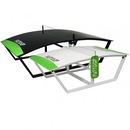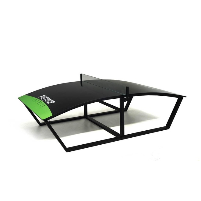 O tampo tem acabamento de verniz o que ajuda a proteger ainda mais da umidade.A base é confeccionada em aço carbono e pintada con pintura epóxi.A rede é produzida em vidro laminado de 10mm.