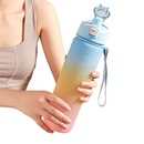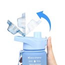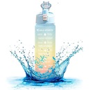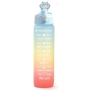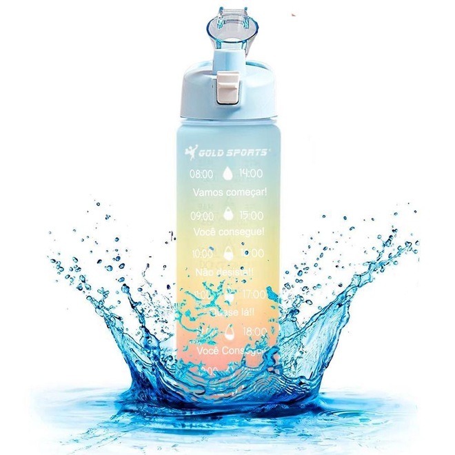 - A Garrafa Squeeze Plástica Gold Sports Timer Mark Siliconada Com Cartela de Adesivos 1Litro BPA-FREE com frase motivacional e marcação de nível de água por horário, para fazer um melhor acompanhamento diário da quantidade de água bebida.