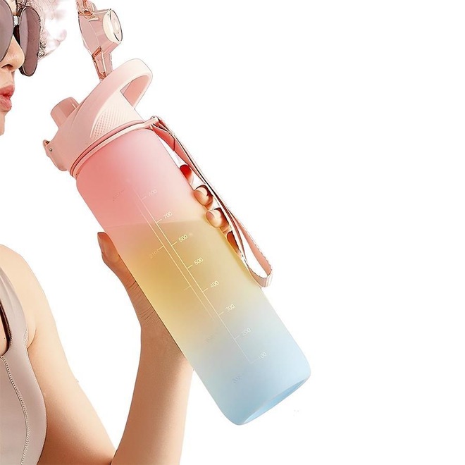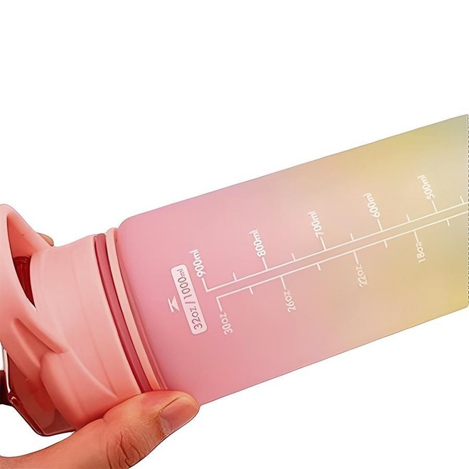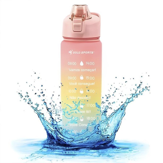 - A Garrafa Squeeze Plástica Gold Sports Timer Mark Siliconada Com Cartela de Adesivos 1Litro BPA-FREE com frase motivacional e marcação de nível de água por horário, para fazer um melhor acompanhamento diário da quantidade de água bebida.