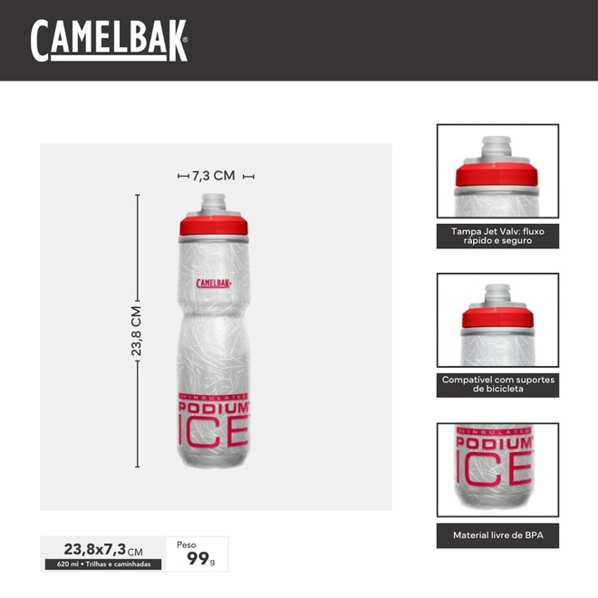 Escolher a Garrafa Squeeze Podium Ice CamelBak é garantir hidratação de alta performance sem preocupações. Se você sente frustração com garrafas que vazam, com material de baixa qualidade ou com difícil limpeza, essa é a solução ideal. Pensada para quem leva o esporte a sério, ela une tecnologia, conforto e durabilidade em cada detalhe.