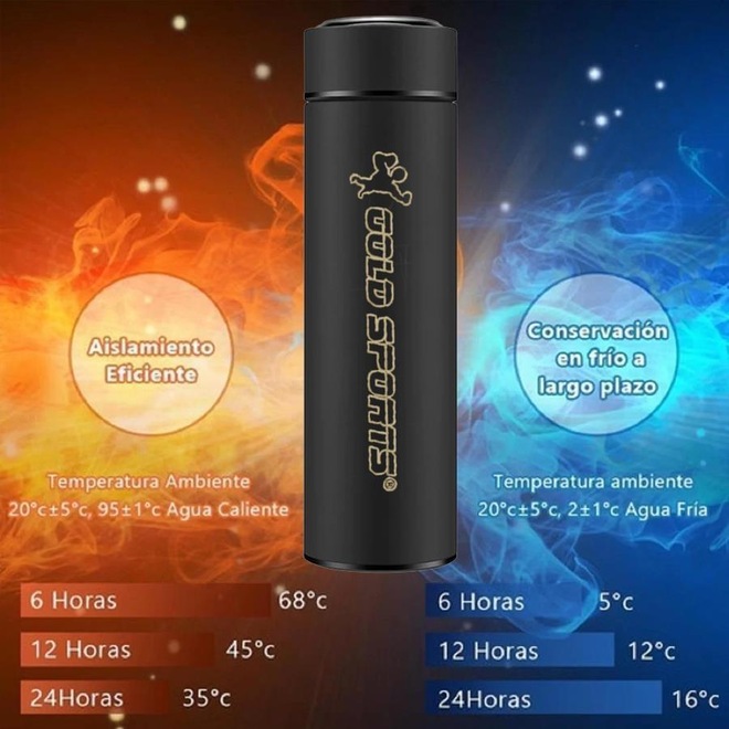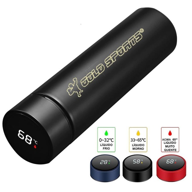 - Sobre o produto - Garrafa Térmica Gold Sports SmartII com Termômetro Digital Infusor de Chá- A Garrafa Térmica Aço Inoxidável 304 Gold Sports SmartII- Com Termômetro Digital de Led Infusor de Chá - Essa garrafa térmica reúne tecnologia, elegância e já é um grande sucesso. - - Totalmente a prova d''''água. - - Possui termómetro e painel touch de Led integrados na tampa que mostram a temperatura do líquido conservado. - - Seu painel é touch bastando tocar nele para mostrar a temperatura interna. - - Para uma medição ainda mais precisa vire a garrafa para baixo e volte para a posição normal antes de tocar no touch. - - A unidade de temperatura Celcius (C°) do painel muda de cor de acordo com a temperatura do líquido. - Quando frio a unidade ficará , quando esta morno a unidade ficará amarela e quando quente a unidade fica vermelha. - - Possui anel de vedação de silicone que impede vazamentos até quando deitadas ou viradas para baixo. - - Vem com infusor no gargalo caso você queira fazer chá. - Ele também ajuda a filtrar líquidos com partículas imersas. - - São fabricadas em plástico livre de Bisfenol e aço inoxidável 304 da família dos Austeníticos, com grande quantidade de ligas ferro, cromo e níquel que conferem alta resistência e proteção contra corrosão. - - Suas camadas internas garantem longa conservação da temperatura e das propriedades da sua bebida. - - Não transfere a temperatura do líquido para a camada externa da garrafa e não transpira, evitando queimar ou molhar as mãos e as superfícies de contato. - Teste de Conservação da Temperatura: - Realizado com água. - - Temperatura ambiente de 23°. - Líquido quente adicionado a 95°: - Após 6h = 65° - Após 12h = 50° - Após 24h = 35º Líquido frio adicionado a 3°: - Após 6h = 5° - Após 12h = 10° - Após 24h = 15º Bateria (CR2032): - O visor de Led utiliza tecnologia de conservação de bateria que mostra a temperatura por apenas 3 segundos. - - A bateria fica localizada na parte traseira do painel de Led. - Substituição da Bateria: - Retire a tampa da garrafa. - - Aplique pressão moderada sobre o painel de Led no sentido de fora para dentro até que o conjunto eletrônico saia da carcaça externa. - - Remova e lente superior com cuidado para ter acesso ao painel de Led. - - Remova o painel de Led no alojamento para ter acesso a bateria. - - Substitua a bateria e coloque o painel exatamente na mesma posição. - - Caso o painel de Led seja instalado na posição invertida a temperatura ficará encoberta pela lente superior dificultando sua visualização. - - Agora basta recolocar a lente superior e inserir o conjunto eletrônico de volta na carcaça externa. - Dicas Importantes: - Essa garrafa não pode ser levada ao forno microondas. - - Não levar em lavadora de louças. - FÁCIL DE TROCAR A BATERIA COMPOSIÇÃO AÇO INOXIDÁVEL E PVC (BPA FREE) CONTÉM: APENAS: 1 UNIDADE(IMAGENS APENAS ILUSTRATIVAS) MARCA: GOLD SPORTS - ref: M0W1VC