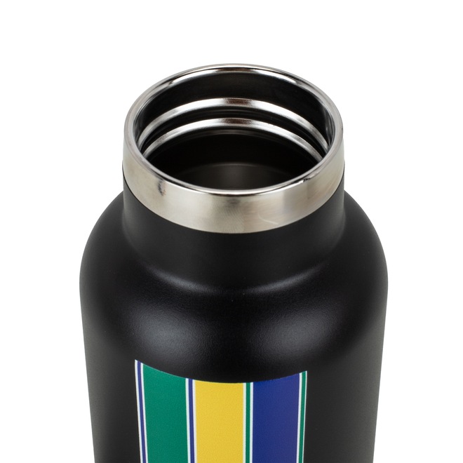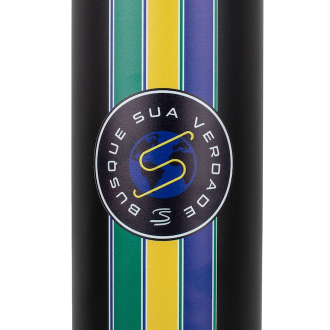Além disso, a frase "Busque Sua Verdade" estampada na garrafa é um lembrete poderoso para buscar autenticidade em todas as suas ações e decisões, seguindo os passos do grande ícone brasileiro Ayrton Senna.