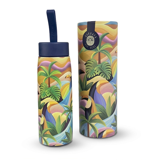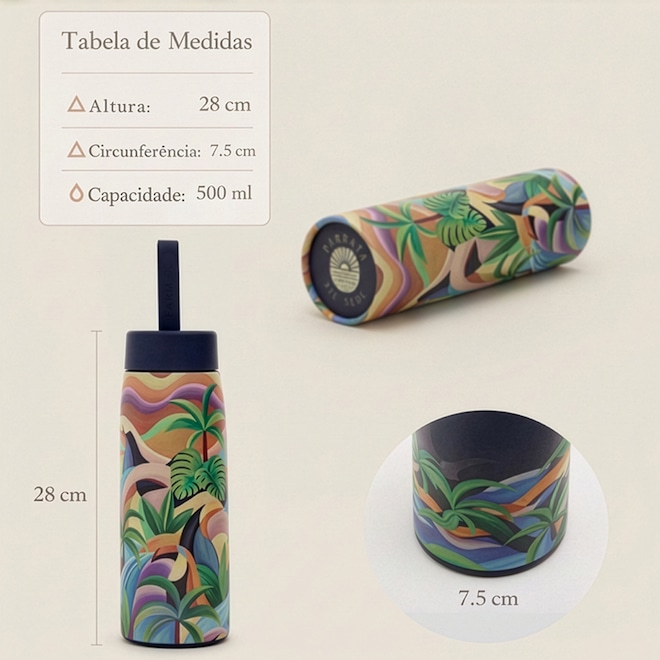 A Garrafa Farm Que Sede Terra Surrealis de 500ml une funcionalidade e o design artístico da marca. Confeccionada em aço inoxidável com isolamento de alta performance, ela conserva bebidas geladas por até 24 horas e quentes por 12 horas. Sua vedação hermética garante segurança total contra vazamentos, sendo a companhia ideal para o trabalho, academia ou viagens, mantendo sua hidratação com a energia única da estampa Terra Surrealis.