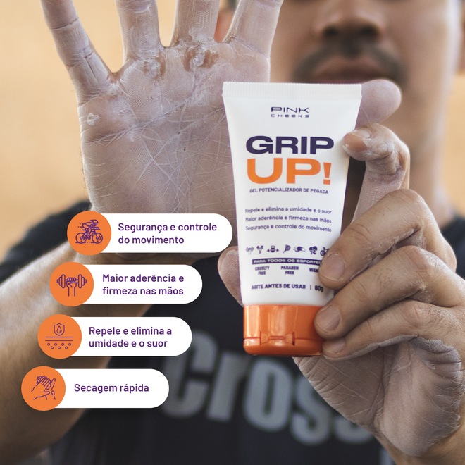 Com fórmula vegana e livre de parabenos, o GRIP UP! é indicado para diversos esportes, como crossfit, beach tennis, tênis, esportes com remo, escalada, pole dance, entre outros. Pode ser utilizado como um substituto ao magnésio em pó, pois combina praticidade, potencialização de pegada e secagem das mãos em um único produto, além de evitar desperdício e sujeira.
