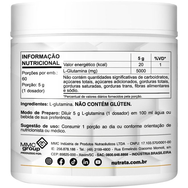 Contém Glúten Não Contém Lactose Não Contém Glicose Não Contém Frutose Não Sugestão de Consumo Por Dia Cuidados de Conservação Manter o produto em local fresco e seco. Registro ANVISA Isento Validade Vide Rótulo SAC do Fornecedor NUTRATA: falecom@nutrata.com.br