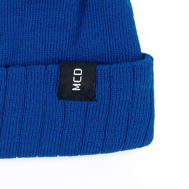 Gorro MCD de tricot, com dobra, etiqueta na dobra e etiquetas personalizadas.