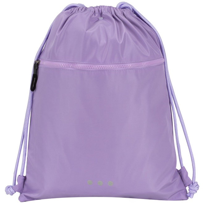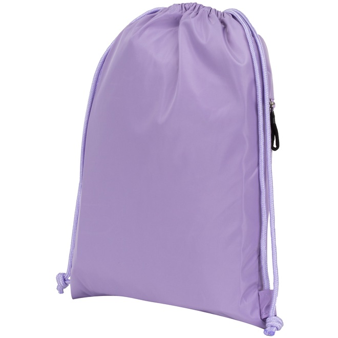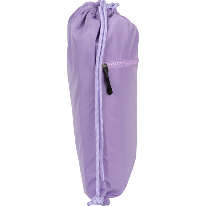 Possui fechamento em cordão, bolso principal amplo e externamente há um com zíper.