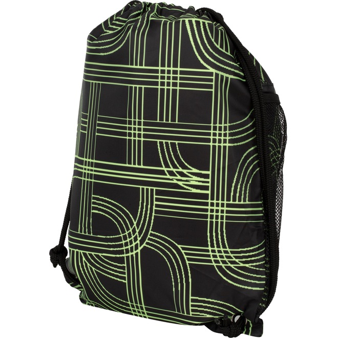 Em poliéster, a sacola esportiva possui compartimento principal amplo com cordões bilaterais que facilitam o transporte nos ombros ou nas costas como mochila.