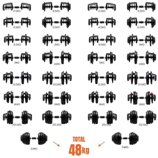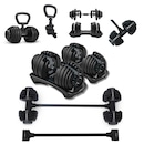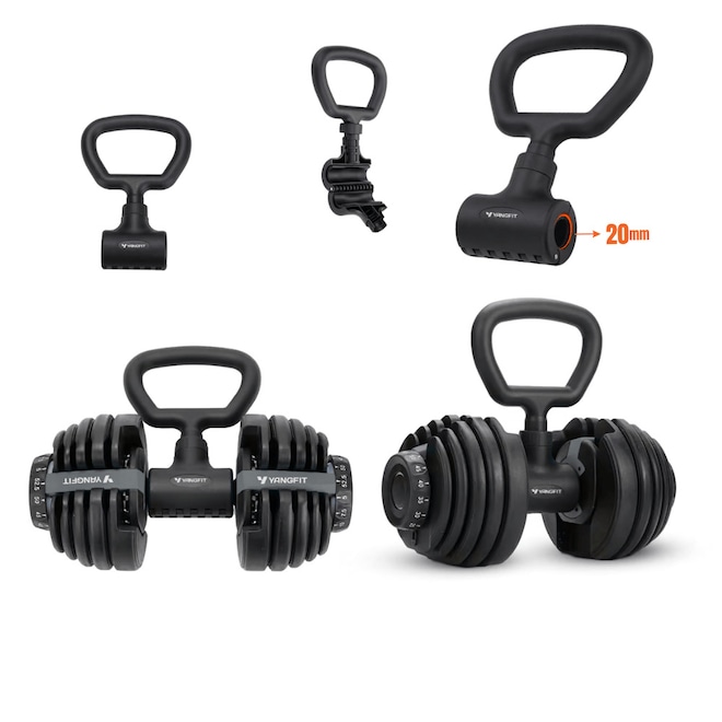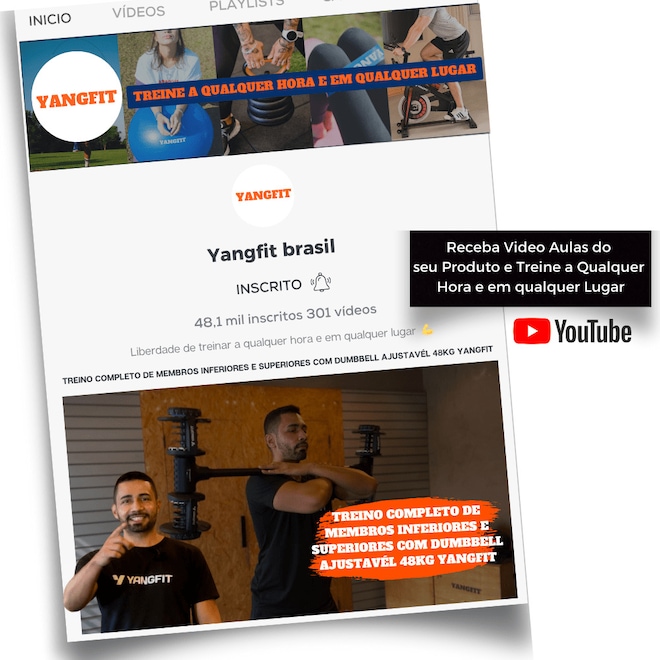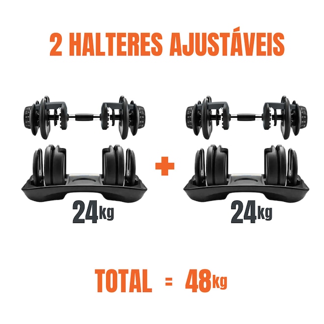Kit Halter Ajustável 50kg com Barra Conectora e Alça Kettlebell Yangfit – 4 em 1, para Treinos em Casa ou Estúdio. Bônus Exclusivo Yangfit Receba vídeo aula do kit Halter ajustável 50kg com barrra conectora e alça kettlebell para você ter liberdade de treinar onde e quando quiser. Não é só equipamento. É saúde, movimento e um Lifestyle leve e saudável. Treine em Casa, estúdio ou no Condomínio com o Kit Halter Ajustável com barra anilha kettlebell Pesos 50kg Yangfit! Versatilidade total para treinos de musculação, funcional e força. O kit inclui: – 2 halteres ajustáveis; – 2 bases para halteres; - 1 barra conectora de 102cm; - 1 alça para kettlebell. Equipamento 4 em 1 que funciona como halteres, barra de musculação, anilha e kettlebell, ideal para quem busca praticidade, evolução e treinos completos em casa, estúdios ou condomínios. Os dois halteres ajustáveis possuem o sistema selector de pesos em suas laterais, basta girá-lo e posicionar no peso desejado em ambos os lados que, ao retirar o halter da base, ele fixará na barra apenas o peso selecionado, e deixará na base o peso restante. Para montar a barra de musculação, basta conectar os dois halteres à barra conectora. A barra montada, tem peso total até 51kg, pois além do peso dos halteres, a barra conectora tem peso aproximadamente 3kg. E para montar o Kettlebell, basta colocar o puxador alça no halter. Exercícios possíveis: Com os Halteres: – Rosca direta, alternada, martelo, concentrada, Scott; – Elevação lateral, desenvolvimento, remada unilateral e curvada; – Supino reto, inclinado, declinado; – Tríceps coice, francês, testa; – Agachamento, afundo, stiff, levantamento terra, gêmeos; Com a Barra de musculação: – Supino reto e inclinado; – Desenvolvimento militar; – Rosca direta 21; – Remada curvada; – Agachamento com barra; – Levantamento terra; – Encolhimento (trapézio); – Stiff; Com o Kettlebell: – Swing; – Agachamento frontal; – Goblet squat; – Desenvolvimento com kettlebell; – Clean, snatch; – Turkish get-up; – Russian twist; – Kettlebell thruster; – Deadlift unilateral; Diferenciais desse Kit de Pesos Ajustável Yangfit: – Versatilidade 4 em 1: halteres, anilha, barra e kettlebell; – Ajuste rápido e prático de peso: ideal para treinos progressivos; – Substitui até 15 pares de halteres tradicionais; – Design compacto, ideal para espaços reduzidos; – Revestimento antiderrapante para mais firmeza; – Fácil de montar e transformar entre as possibilidades de combinações. Especificações Técnicas: – Peso total do kit montado: até 51kg (24kg cada halter, e 3kg da barra conectora); – Variação de Peso em Cada Halter: 2,5kg // 3,5kg // 4,5kg // 5,5kg // 6,5kg // 8kg // 9kg // 10kg // 11,5kg // 13,5kg // 16kg // 18kg // 20,5kg // 22,5kg e 24kg; – Barra conectora: comprimento 102cm, suporta até 50kg montada; – Diâmetro do gancho do puxador alça (que conecta a Halter para formar Kettlebell): 20mm; – Material: Anilhas e Barras são de Aço reforçado, e suporte dos halteres são de ABS resistente.