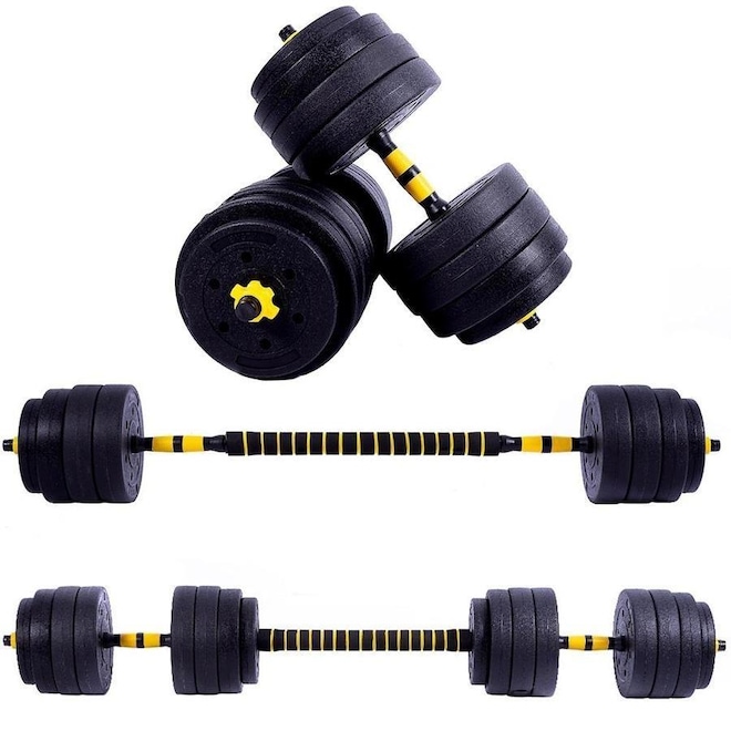 São barras halteres com rosca, anilhas, barra central com revestimento de espuma e conjunto de presilhas para você reinventar a forma de treinar em casa mesmo.