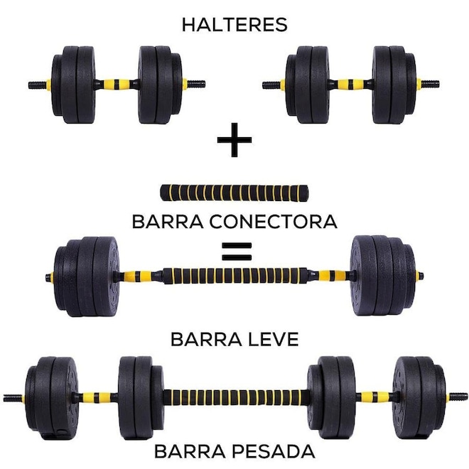 São barras halteres com rosca, anilhas, barra central com revestimento de espuma e conjunto de presilhas para você reinventar a forma de treinar em casa mesmo.