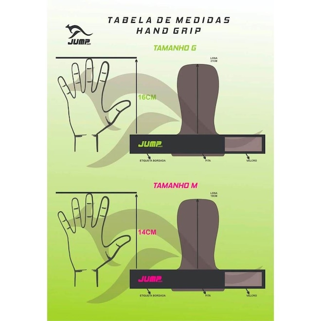 G - Lona: 21cm; Medida da base da mão à ponta do dedo: 16cm.