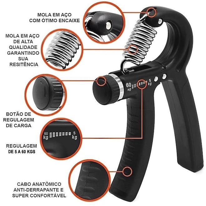 O seu exercício é muito simples, basta apertar de forma contínua para sentir o esforço dos dedos. Ajuste de tensão da mola de 5 a 60 kgs.